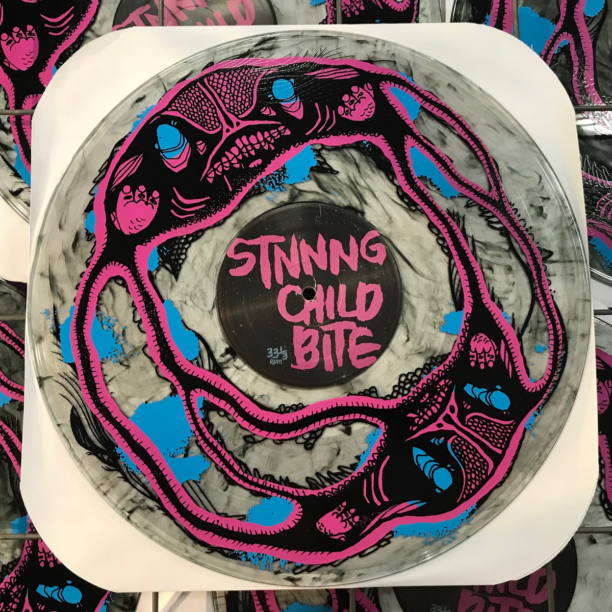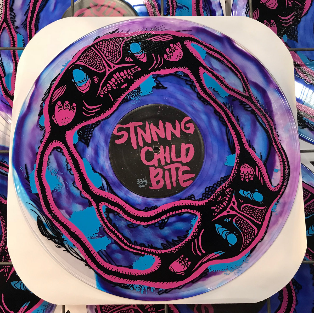 This is the "standard" version of the STNNNG/Child Bite split LP. Available in either clear vinyl w/black streaks or purple vinyl with blue swirls (each limited to about 240 copies) with multi-color silk-screened A-side. Keep in mind that no two are alike - some might be more purple than blue, some more blue than purple. The clear ones all have varying amounts of black. Also, they are hand-numbered but most of the numbering is smeared. The silk-screened art isn't though! They all rule! Get some!
